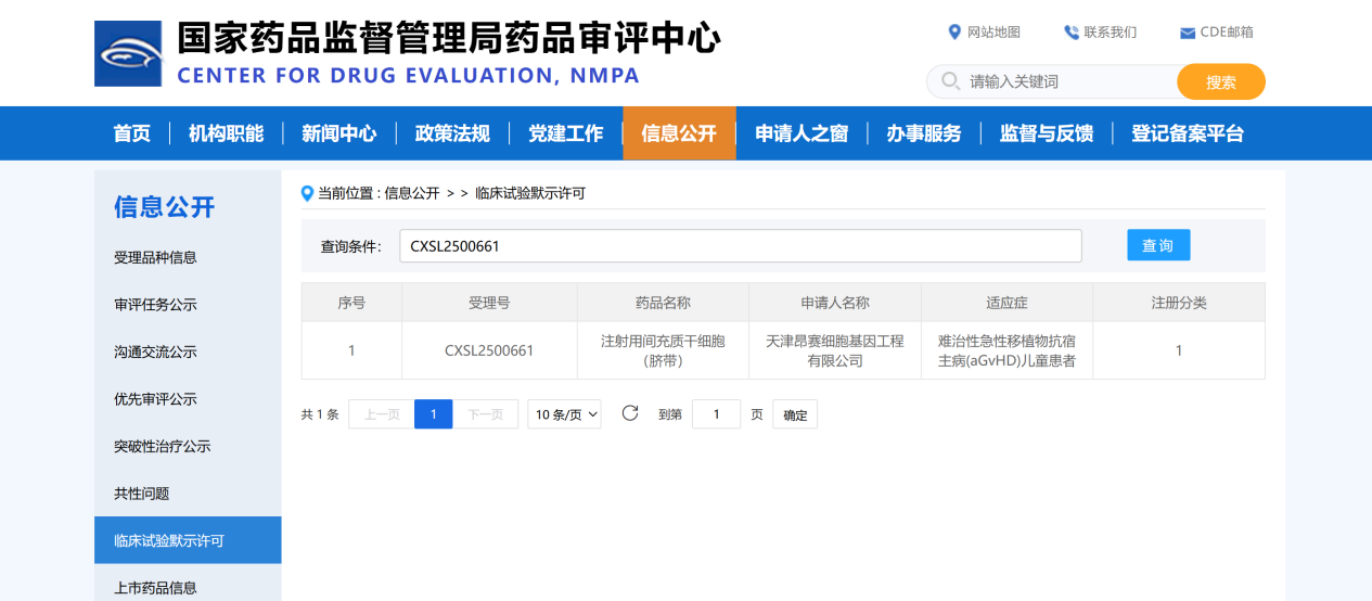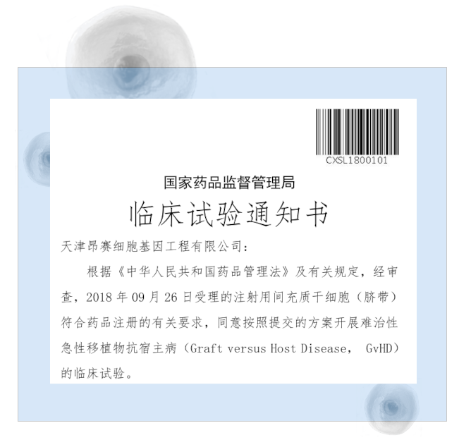 2025年11月3日, 天津昂賽細(xì)胞基因工程有限公司申報的注射用間充質(zhì)干細(xì)胞(臍帶)治療難治性急性移植物抗宿主病(aGvHD)兒童患者的適應(yīng)癥獲得國家藥品監(jiān)督管理局臨床試驗(yàn)?zāi)驹S可